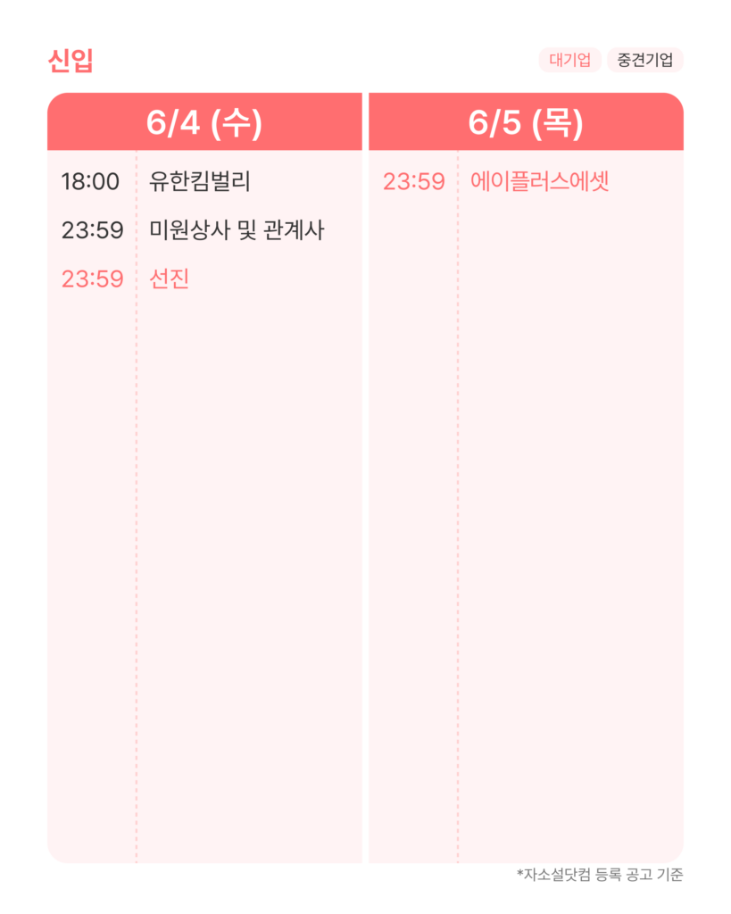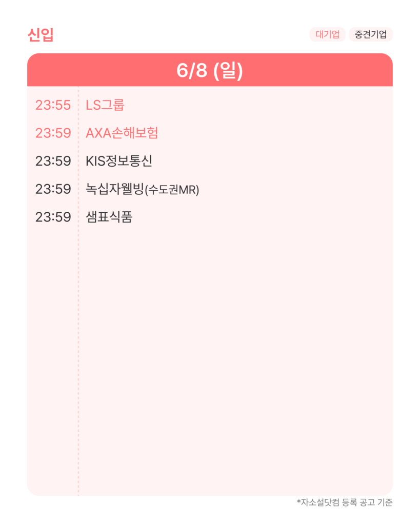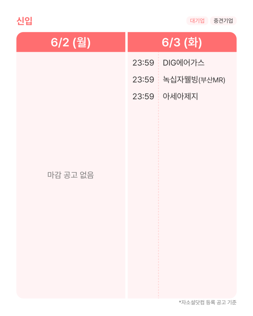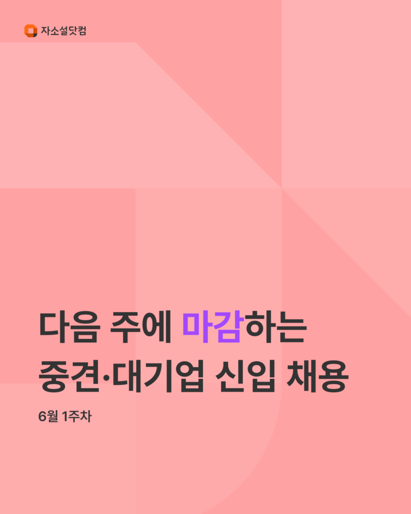 6월 1주차(6/2~6/8)에 서류 지원을 마감하는 중견·대기업 신입 공고만 골라 소개해 드릴게요.