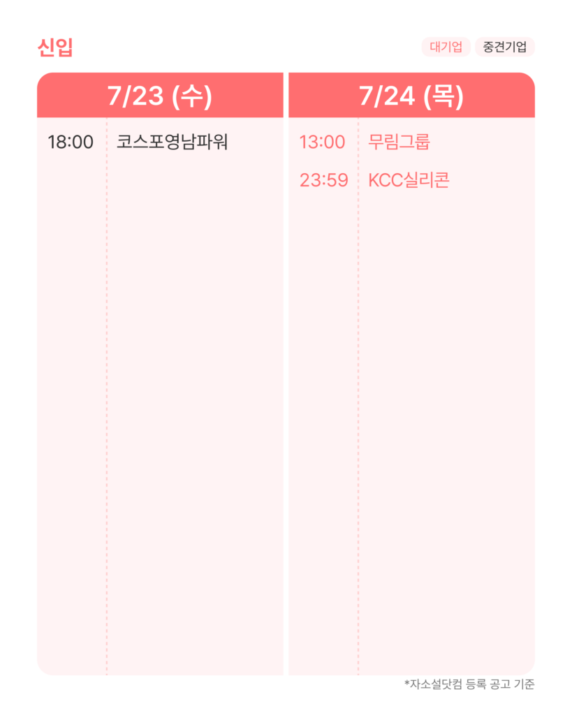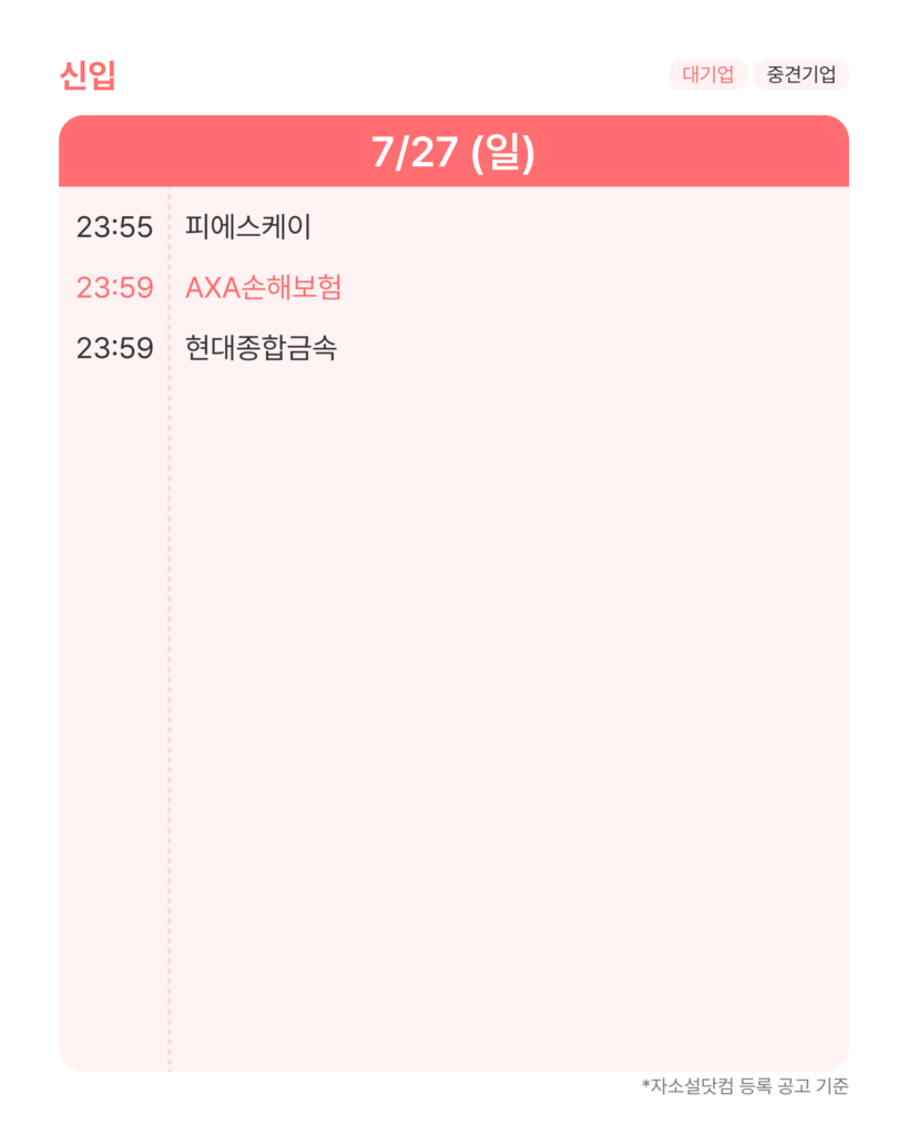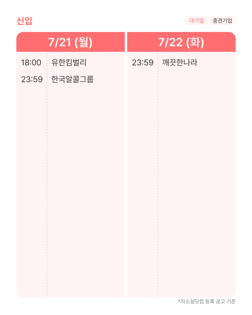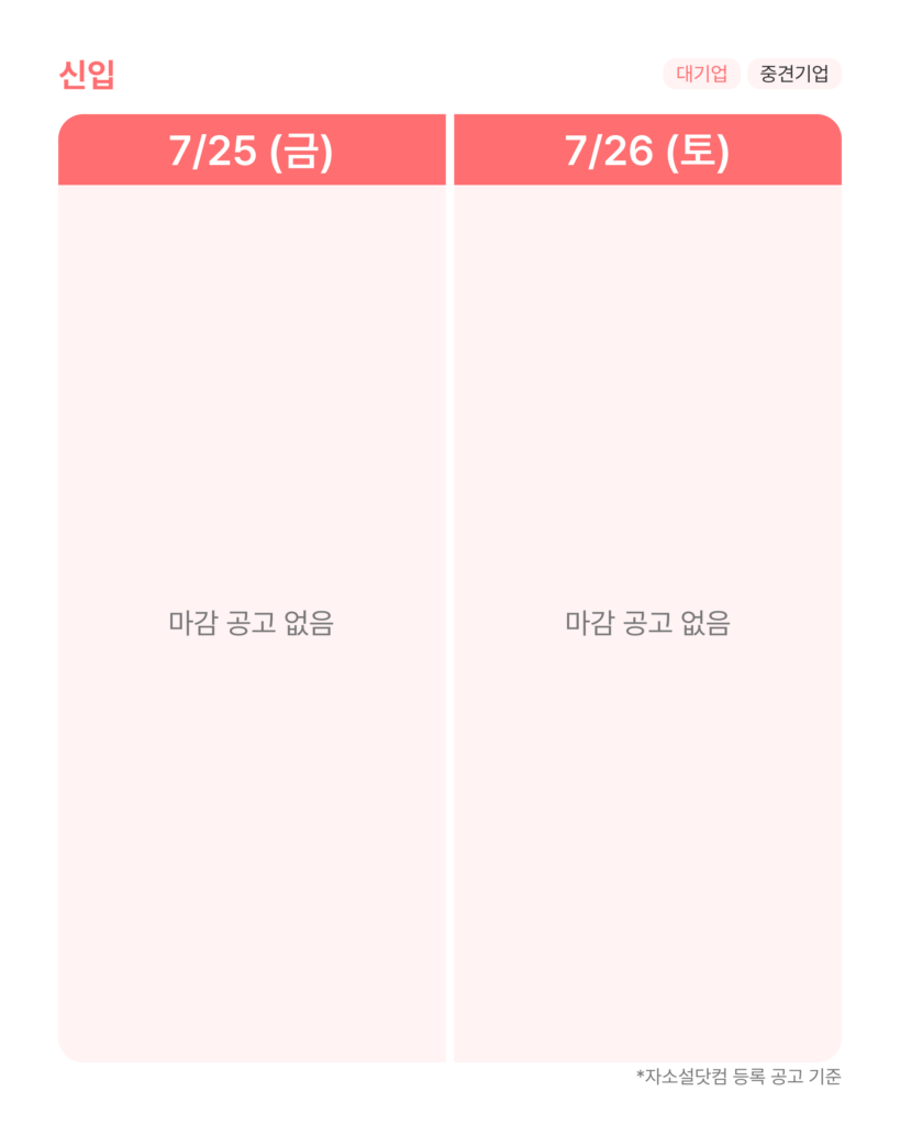 7월 4주차(7/21~7/27)에 서류 지원을 마감하는 중견·대기업 신입 공고만 골라 소개해 드릴게요.