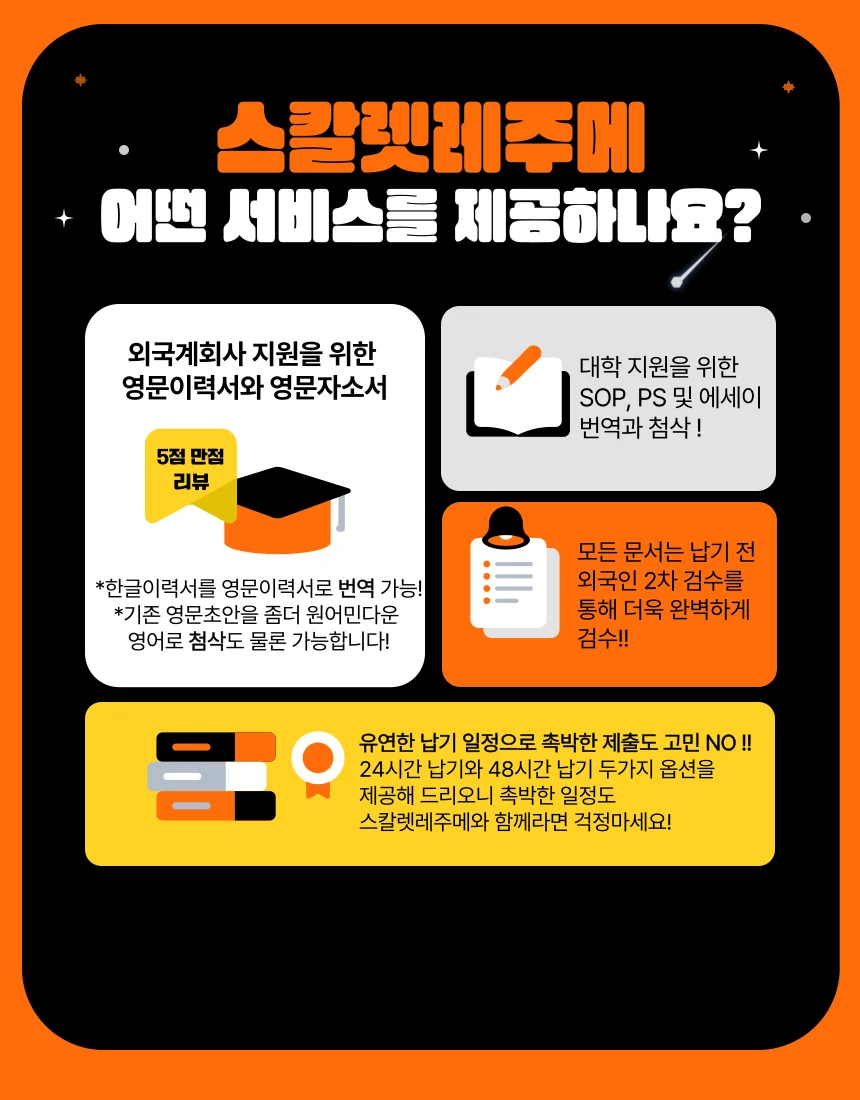 정확하고 빠른 번역과 첨삭으로, 여러분의 외국계 취업 성공률을 수직 상승시켜드립니다. 당장 내일 제출이어도, 스칼렛레주메와 함께라면 가능합니다.
