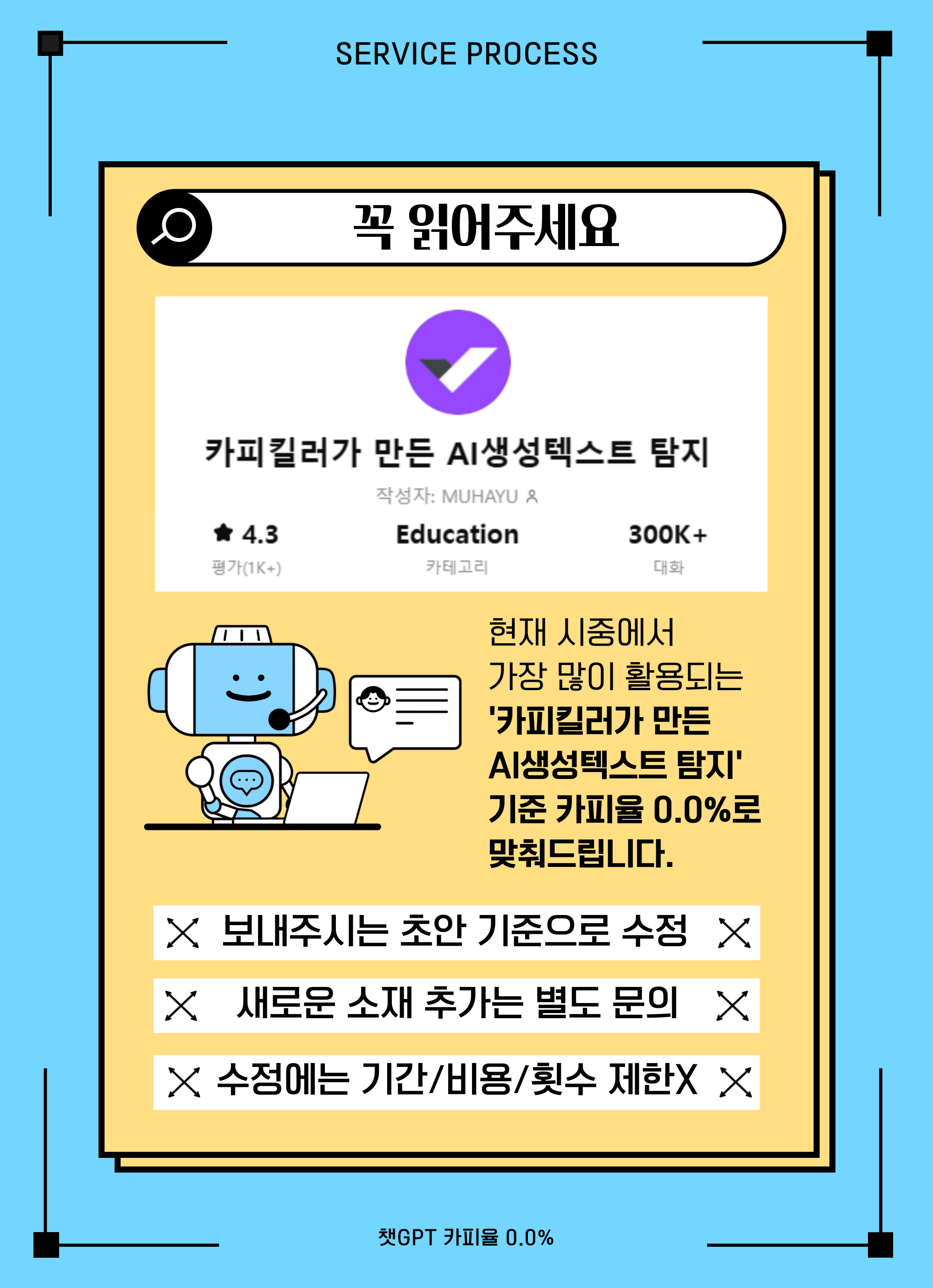 ※ 본 서비스는 챗GPT로 자소서 초안을 작성하시거나, 혹은 직접 자소서를 쓰셨는데도 AI 카피율이 높게 나오는 고객님들을 위한 상품 입니다.