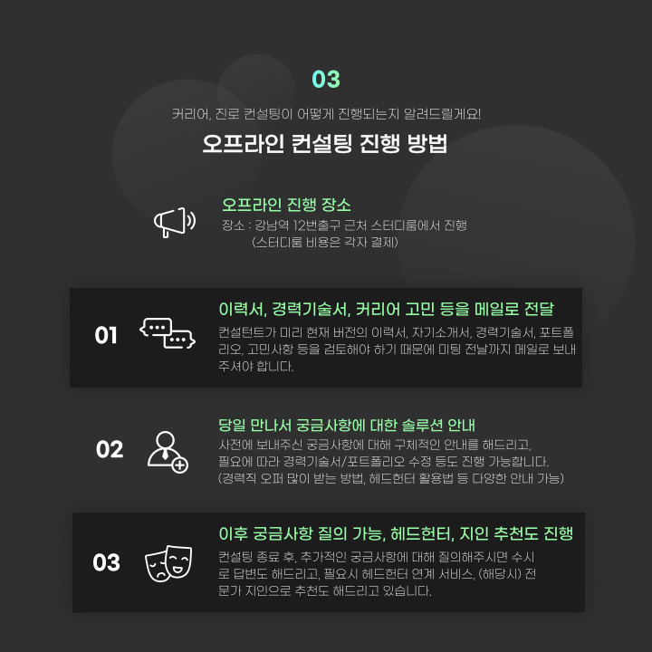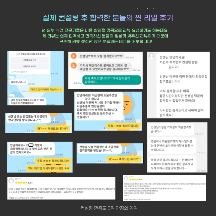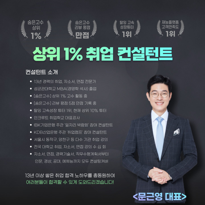 하지만 여러분, 다른 사람들 합격한 거 얘기 들어봤자 뭐하나요? 나를 통과시켜주는 게 중요하지, 과거는 그다지 중요하지 않습니다. 저는 13년의 기간동안 컨설팅 경험과 노하우를 토대로 여러분이 짧은 시간 안에 합격할 수 있도록 도와드릴 것입니다. 회사 다니면서 몰래 투잡하는 사람이 아닌, 취업 컨설팅만 전문으로 하는 전문가로서 여러분이 원하시는 기업 합격하실 수 있도록 최선을 다해서 도와드리겠습니다!