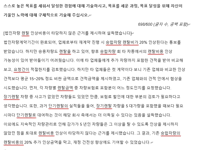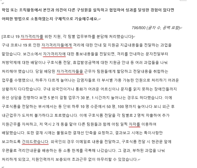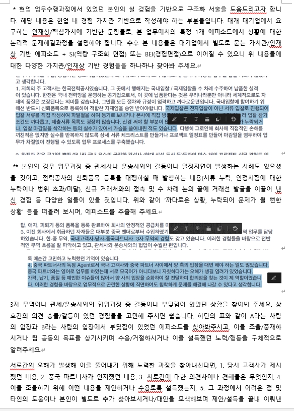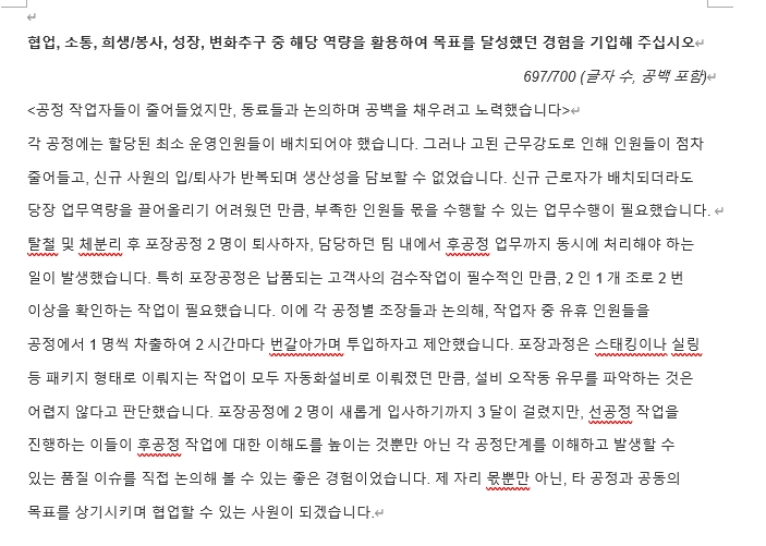 6. '~한 경험에 대해 기술해 주세요' 등의 500, 700, 1,000자 등 기업이 요구하는 자수에 맞춘 논리적인 경험 서술이 필요한 경우