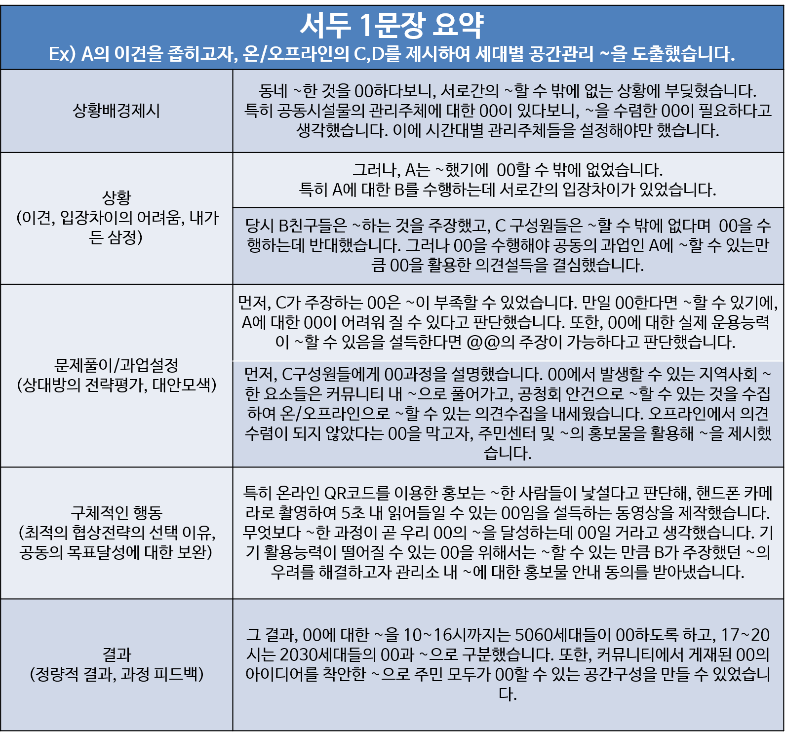 ● 하단은 실제 지원자의 경험 에피소드를 추출하기 위해, <자유양식 자기소개서>의 문항별 논리구조/가이드라인을 발송드린 예시입니다. ●