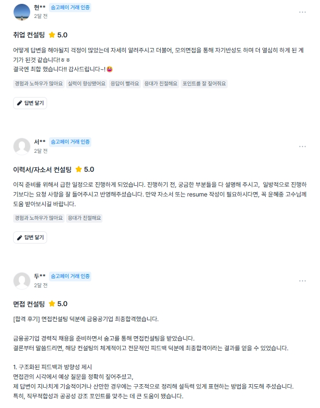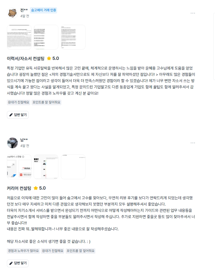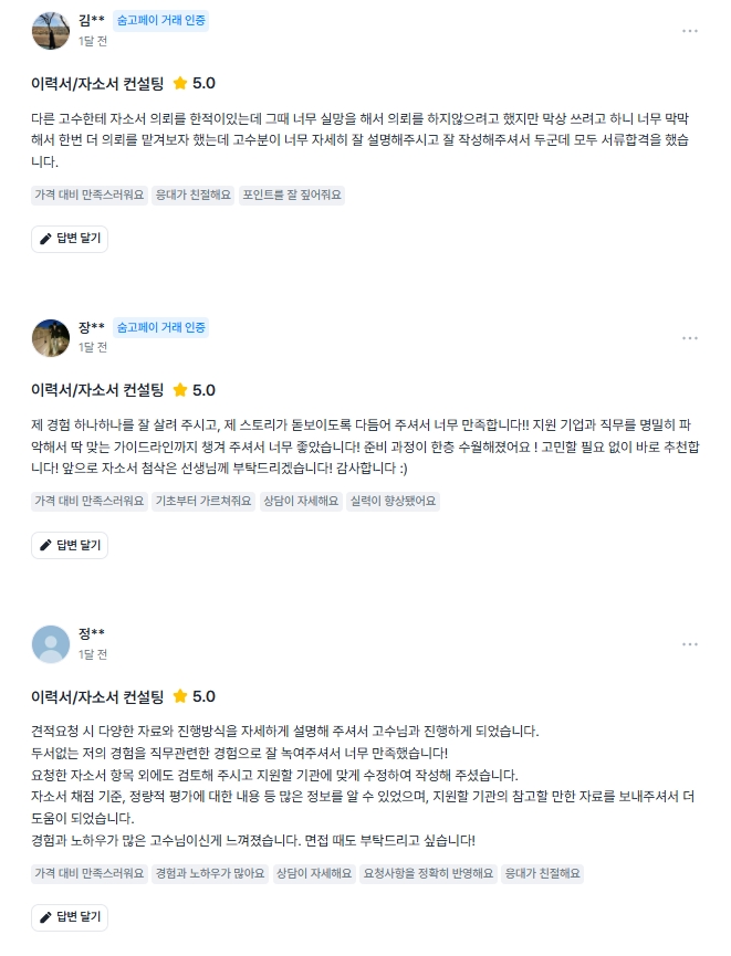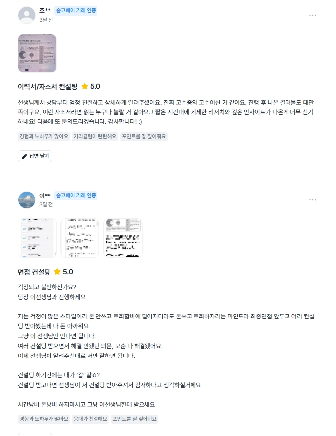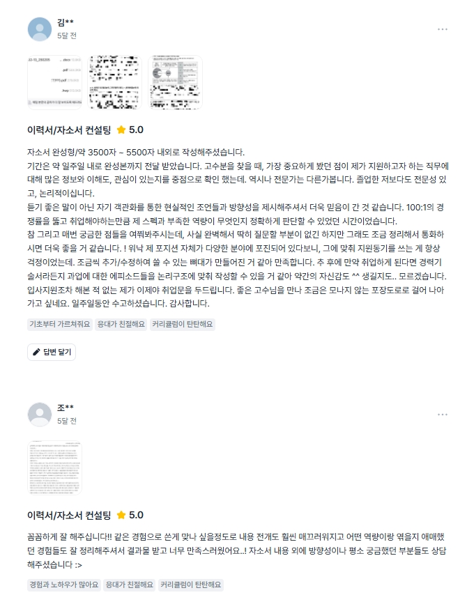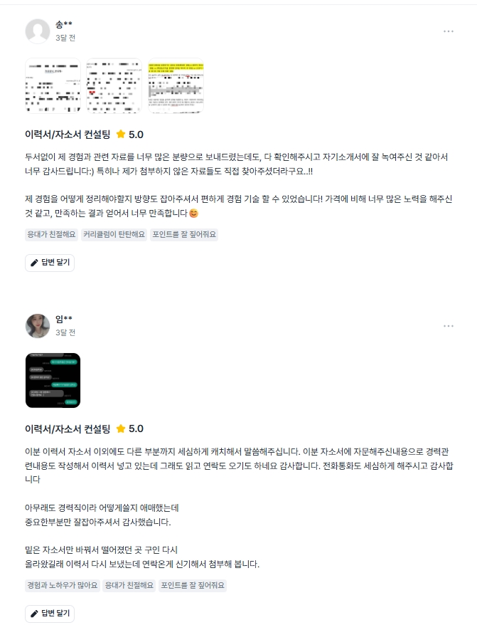 👆자기소개서 첨삭/완성 서비스 제공 시 해당 기업이나 직무에 관한 자기소개서 작성과 이해도, 지식/스킬 및 자격들을 활용한 업무 방향을 제시할 수 있는지, 면접 대비 시 기업/직무에 대한 인사이트를 기반으로 커스터마이징 된 질문들을 추출/편성 및 피드백 할 수 있는지를 꼭 살펴보세요.