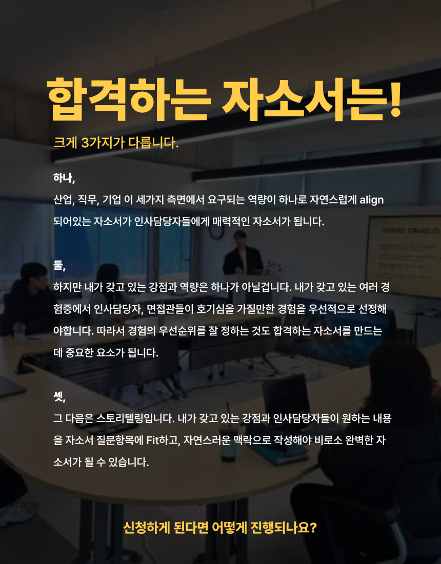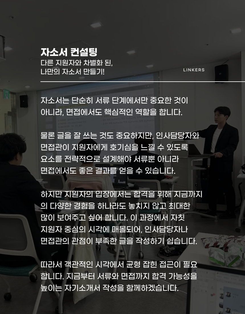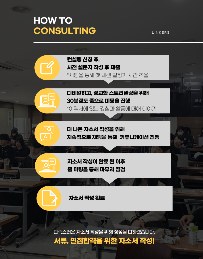 텍스트에 머무는 자소서가 아닌, 진정성을 더해 합격을 여는 자소서를 돕겠습니다.